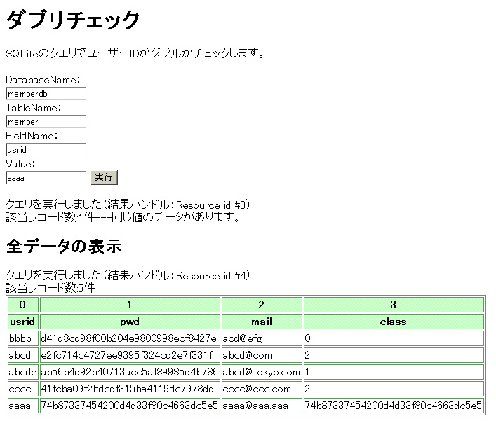 同一値がチェックできるページを作成したので、そのソースを示しておきます。これは、いろいろなSQLiteデータベースのテーブルのフィールドのチェックに使える汎用的なものです。データベース名、テーブル名、フィールド名を変えて使用できます。