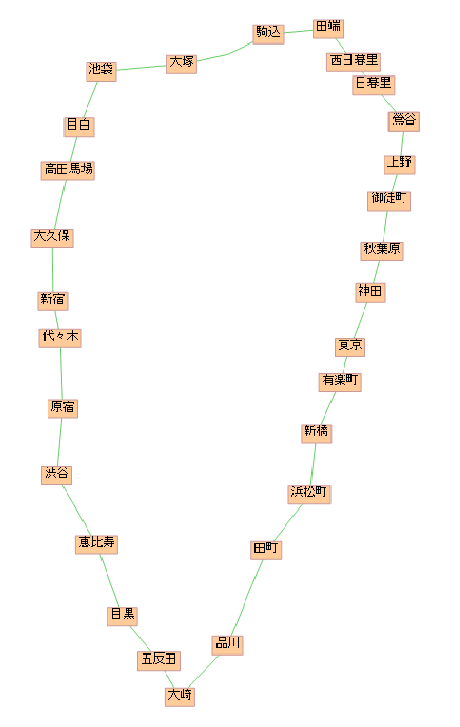 このようにしてできたのが「VML山手線路線図」です。駅の離れ具合がわかりますね。